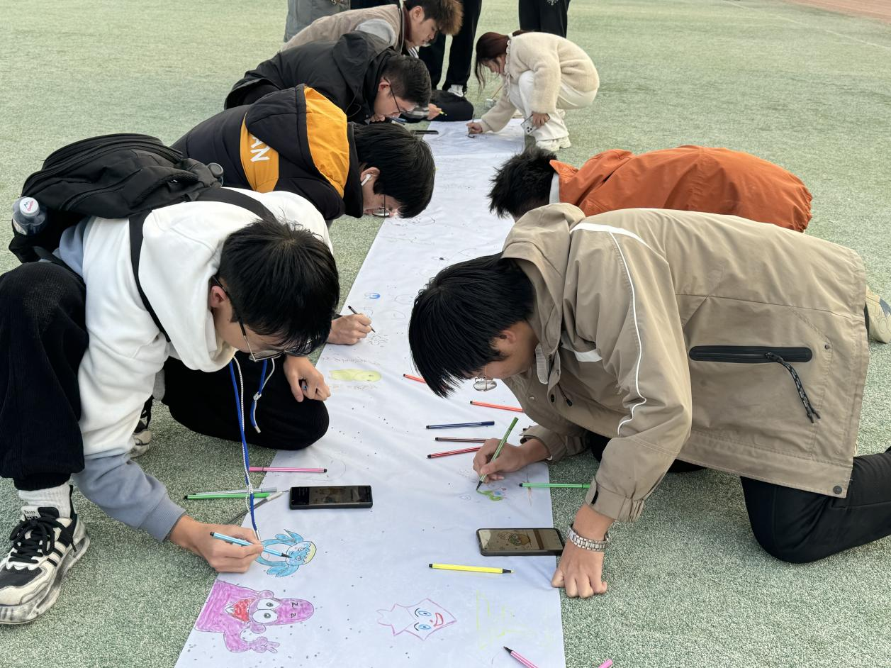 本次活动设置了两项轻松愉悦的互动游戏,第一个活动是以画抒情,同学们自己挑选颜色和图案,选择不同主题的绘画涂鸦,在创作的过程中,大家共同协作、相互启发,一起绘制出一幅充满创意的班级集体画。这个环节不仅有效释放压力,而且促使同学们进一步了解自我、走近他人、融入集体。